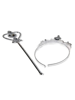 Cet ensemble comprend une couronne argentée scintillante et une baguette magique assortie, ornées de détails brillants qui captent la lumière. Les finitions soignées et les matériaux de qualité assurent un rendu élégant et féérique qui ravira les enfants.